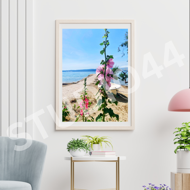 The vast blue sky overhead, adorned with delicate wisps of cloud, enhances the dreamy, peaceful atmosphere, while distant greenery adds a touch of vibrant contrast to the composition. A perfect addition to any space, *Beached* invites you to pause, breathe, and immerse yourself in the soothing rhythms of Croatia’s coastal charm.